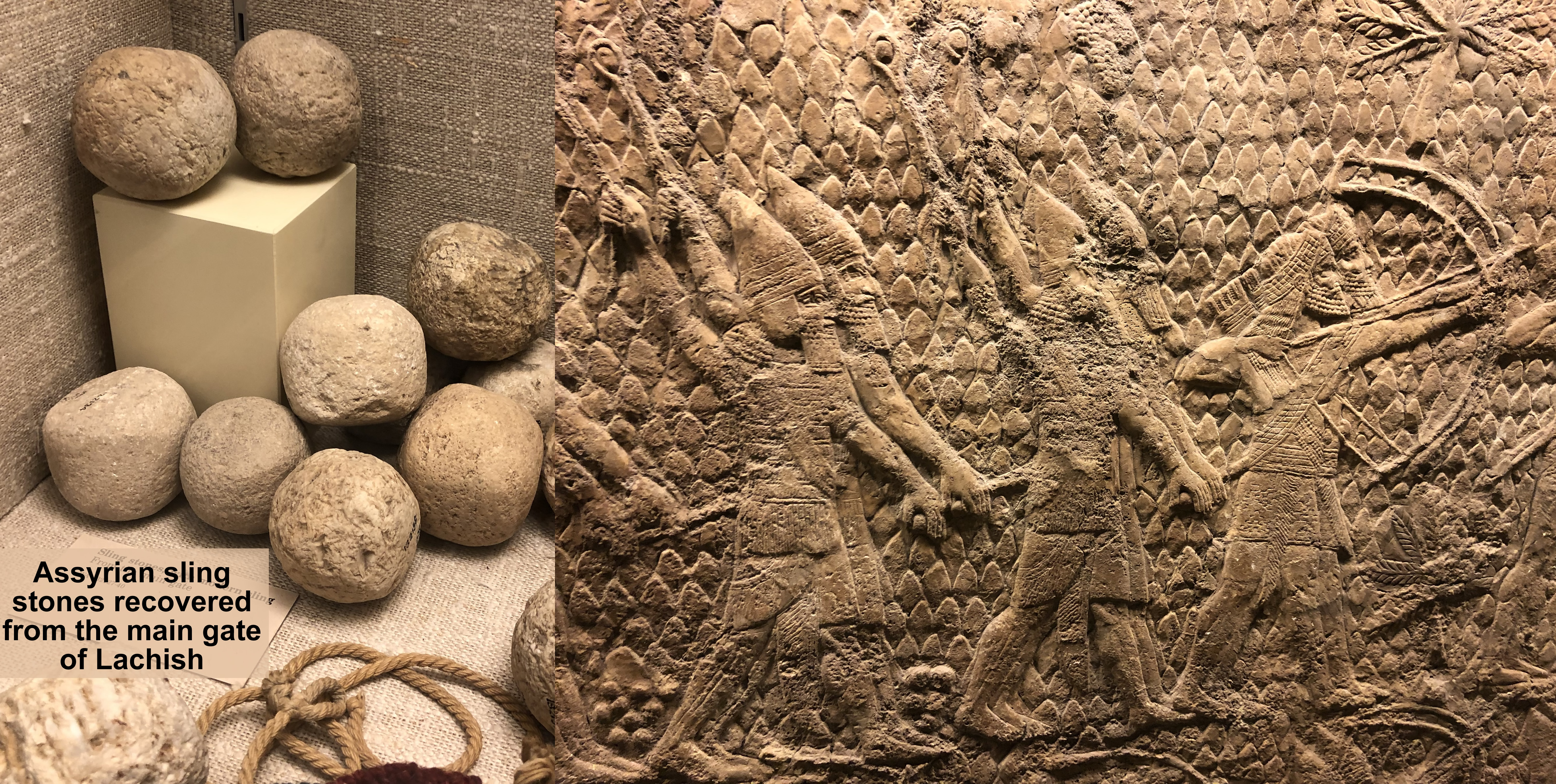 Assyrian slingers attack Lachish and the slingstones found at the city gate of Lachish displayed in the British Museum